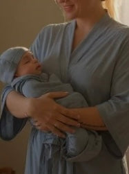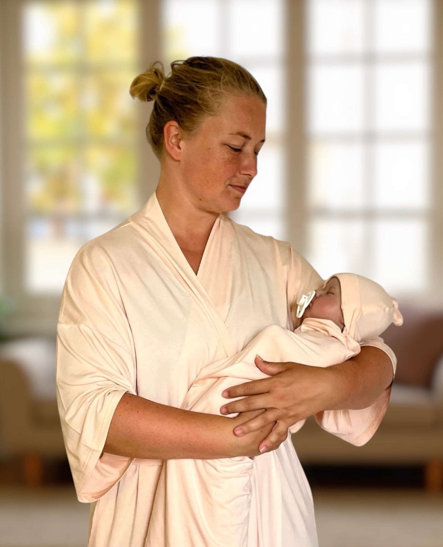 En ideel gave til babyshower eller fødsel. Mor kan føle sig stilfuld og bevæge sig komfortabelt rundt på fødeafdelingen, mens baby puttes i det bløde svøb for maksimal tryghed. Brug sættet til de første billeder med din nyfødte – og hav det klar til besøg efter fødslen. Feminint og praktisk. STANDARD 100 by OEKO-TEX®